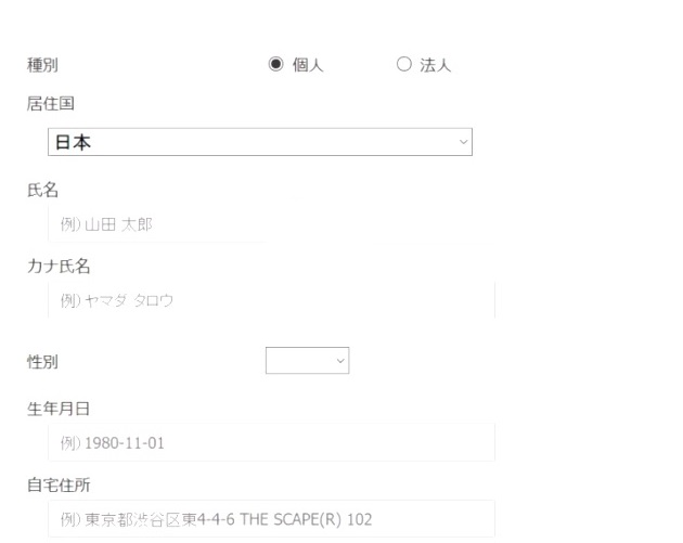 電話番号認証が完了したら、氏名や性別、生年月日といった基本情報を入力しましょう。種別は個人を選択し、住所は必ず部屋番号まで入力してください。