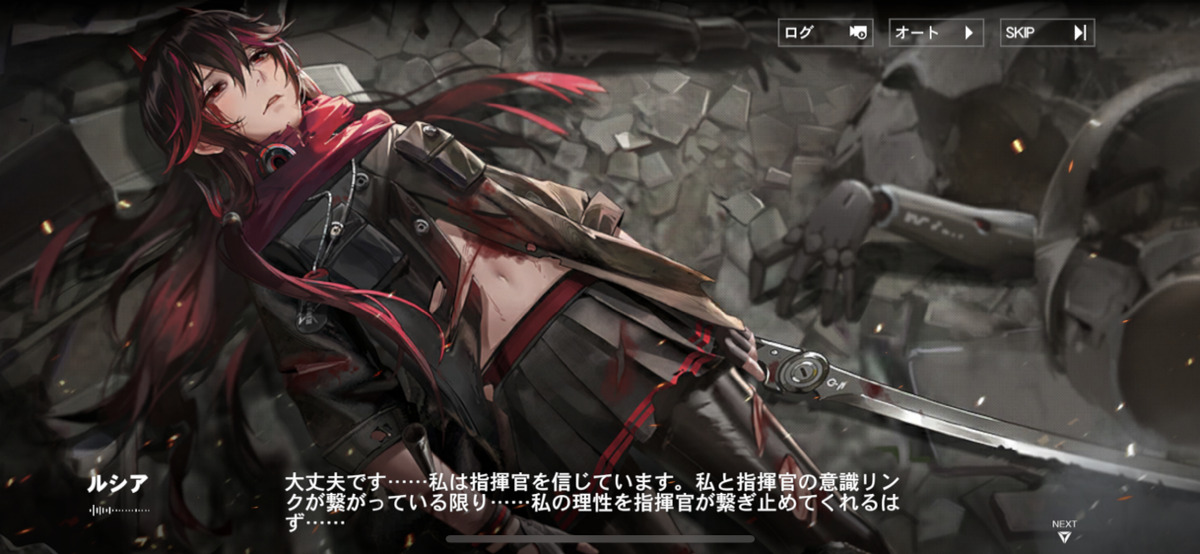 浸食体の残骸に倒れ込んでいる”ルシア”が登場し、プレイヤーである指揮官に状況を尋ねてきます。