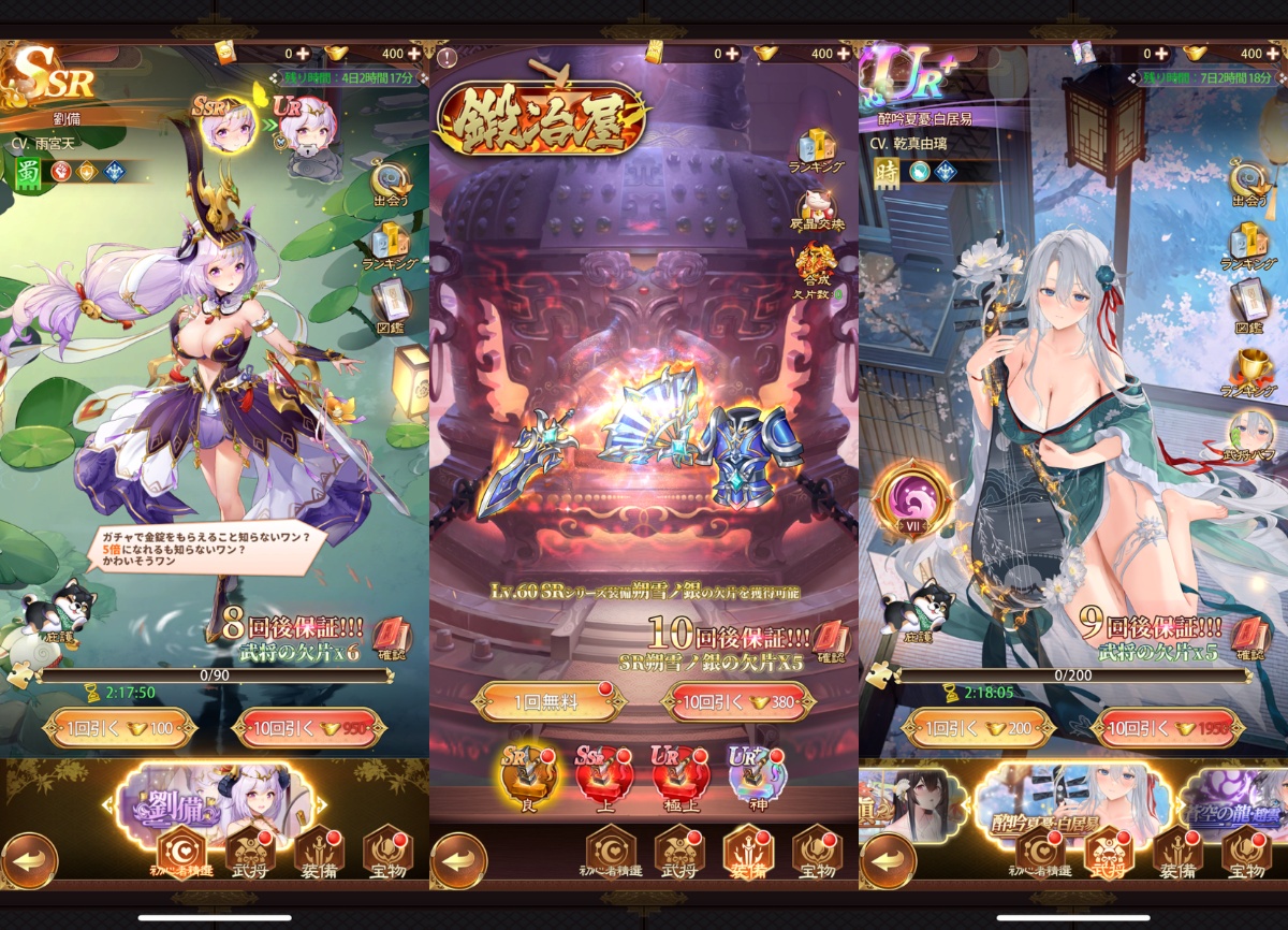 少女廻戦では、初心者が気楽に試せる初心者精進ガチャや人気武将を仲間にできる武将ガチャなどがありました!